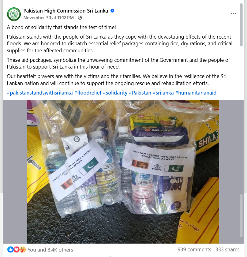 Similarly, on November 29th, the official Facebook page of the Pakistan High Commission in Sri Lanka posted the instances of the items being taken out from the Pakistani ship PNS SAIF, anchored at the Colombo Port, to support the victims, and the items officially donated and packaged by the Sri Lankan navy.