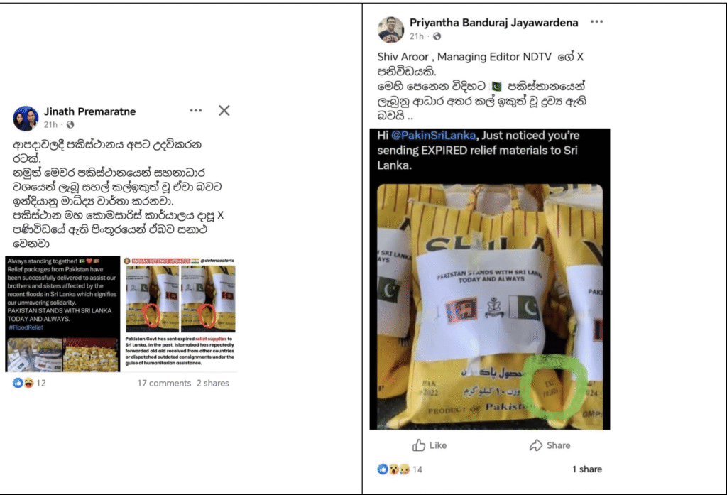 With the disaster affecting Sri Lanka, a lot of false and misleading information is shared through social media platforms. Among these, a post was shared stating that the relief aid sent by Pakistan to Sri Lanka had expired. Here is a fact-check we conducted in this regard.