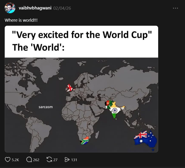 A social media post featuring an image of a world map highlighting the countries claimed to be participating in the Cricket World Cup has been circulating online. The post includes the caption, roughly translated as, “So this is all the world that plays cricket?” and further questions whether it is even appropriate to call it a “World Cup.”