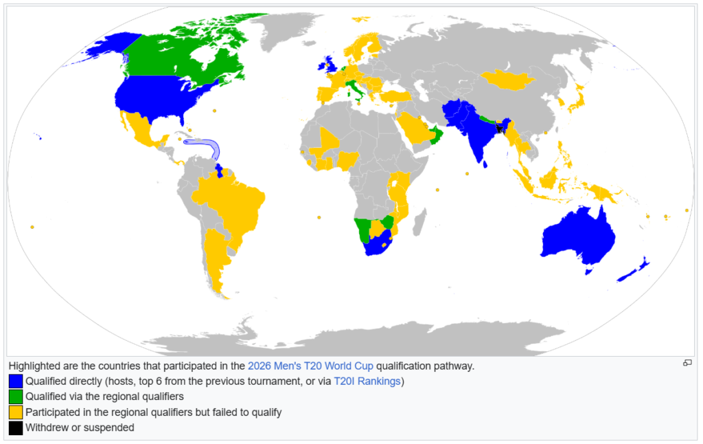 In the map above, the countries shown in blue are the 12 teams that have directly qualified for the 2026 T20 World Cup. These include the host nations, India and Sri Lanka, who automatically qualify; the Super 8 teams from the 2024 T20 tournament — Afghanistan, Australia, Bangladesh, England, South Africa, West Indies, and the United States; and the remaining three from the top-ranked teams by T20I rankings — Pakistan, New Zealand, and Ireland.