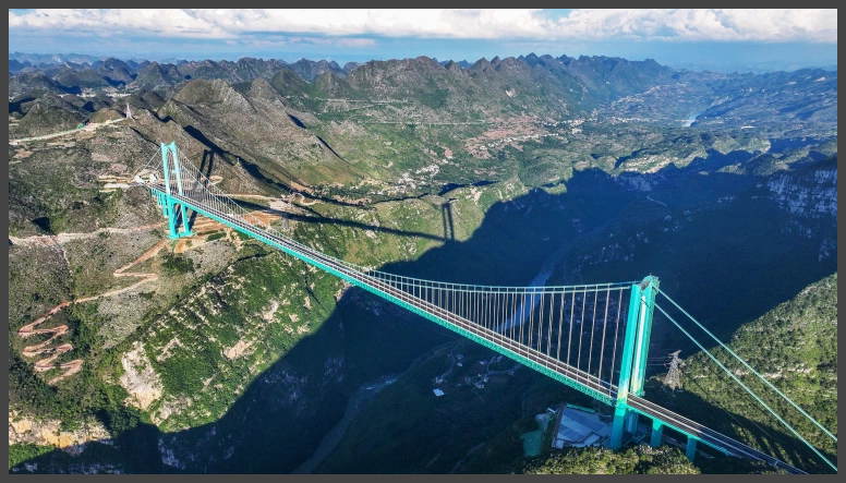 The Huajiang Grand Canyon Bridge in Guizhou province spans the Beipan River gorge and opened to traffic on 28 September 2025. According to official sources, it has a deck height of 625 metres and a total length of 2,890 metres, with a 1,420 metre main span.