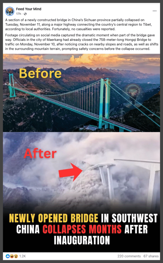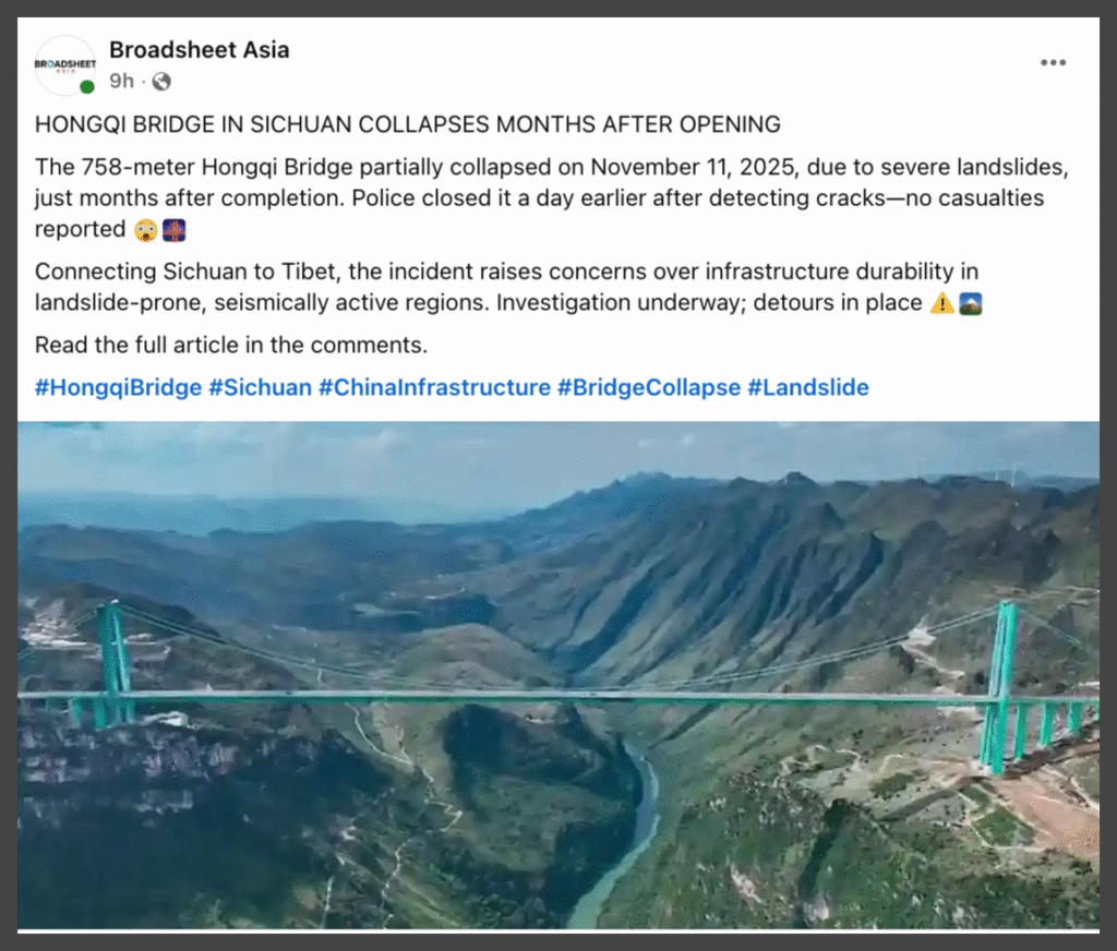 On 11 November 2025, the Hongqi Bridge in Sichuan Province partially collapsed. The 700-metre bridge drew worldwide attention on social media. However, many posts incorrectly use images of an unrelated bridge, the Huajiang Grand Canyon Bridge, creating confusion about which structure actually failed.