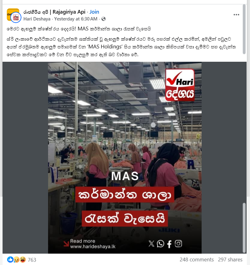 In this context, below is our fact-check regarding recent social media posts about the Methliya factory, which handles MAS’s garment production operations, and about MAS Holdings itself.