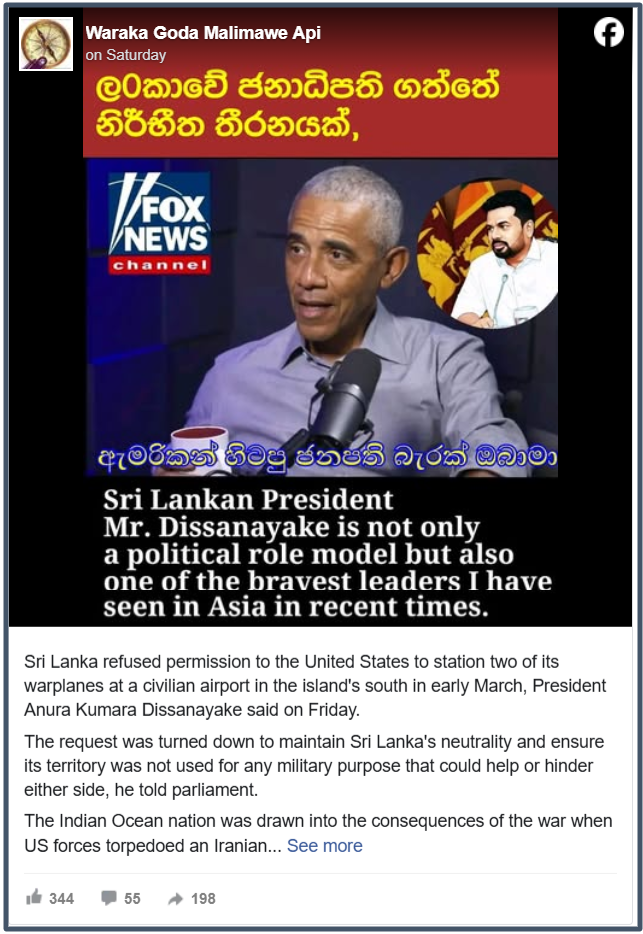 Our investigation shows that viral posts claiming that former US President Barack Obama made a statement on Fox News, praising the Sri Lankan President, Anura Kumara Dissanayake, are false.