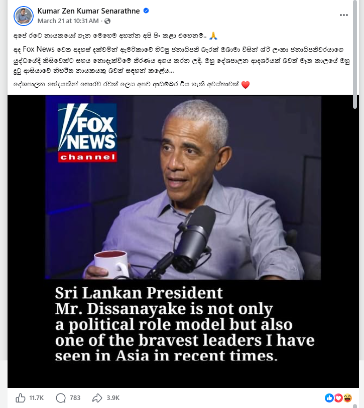 The following social media post states that on March 21, former US President Barack Obama, speaking to Fox News, praised the Sri Lankan President for his decision not to support any side in the US-Israel-Iran war. Accordingly, it is stated that Barack Obama has praised the Sri Lankan President as a political role model and as one of the bravest leaders in Asia that he has seen in recent times.