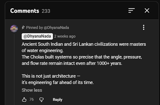 A YouTube video was published in English, targeting Indian readers, claiming that ancient South Indian and Sri Lankan civilizations were capable of creating amazing water systems. It stated that an ancient water tap built more than 1,000 years ago by the ancient Chola emperors is still functioning properly.