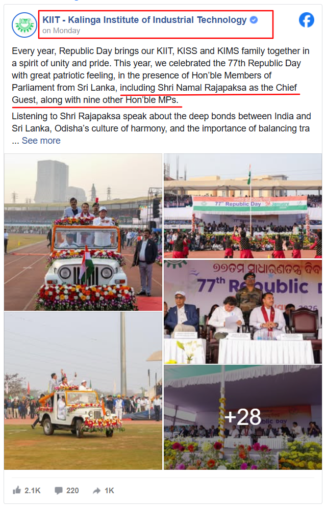 The official Facebook page of the Kalinga Institute of Industrial Technology had also published a post stating that MP Namal Rajapaksa had participated as the chief guest at the Republic Day celebrations they held. KITT | KISS