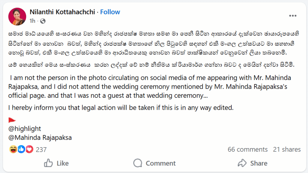 We also inquired with Mrs Nilanthi Kottahachchi about this photo, and she said she was not the person in the circulated photo and that she did not attend the wedding, nor did she know about it. She has also posted a statement on her Facebook page.