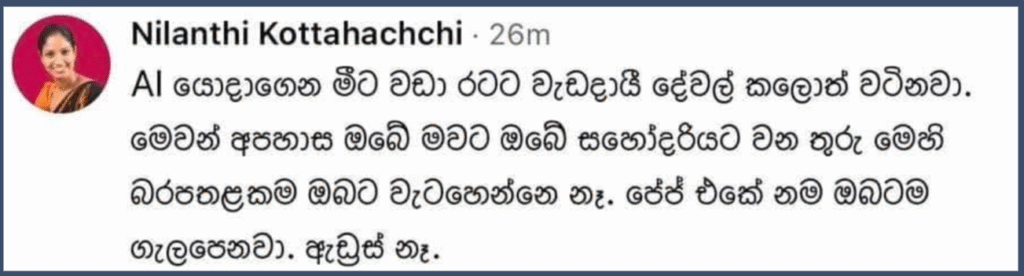 Before posting the above statement, Mrs Kottahachchi had responded to the circulated social media post, stating that the photo had been generated using AI.