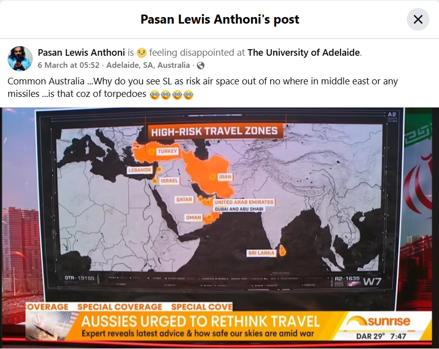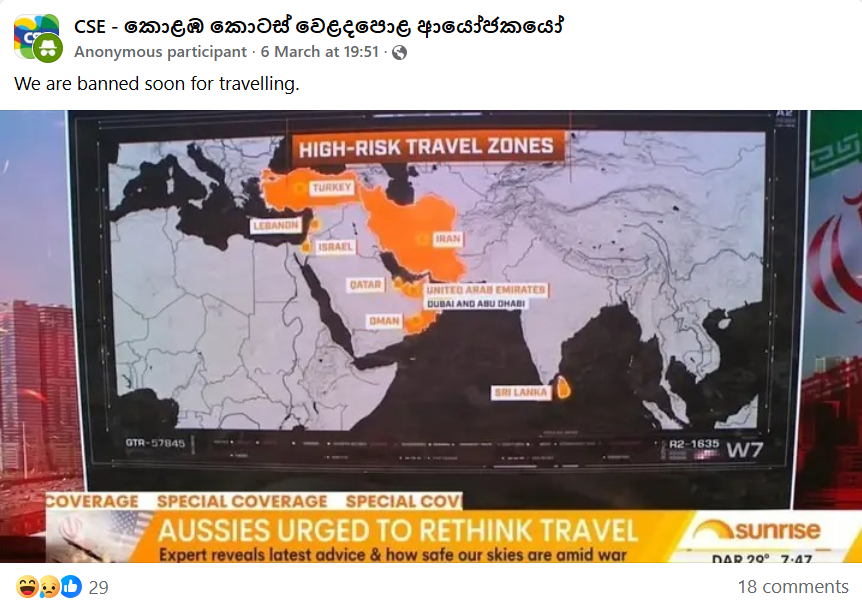 Amid the ongoing conflict in the Middle East, posts from an Australian media network circulated on social media claiming that Sri Lanka was a high-risk travel destination, alongside those countries.