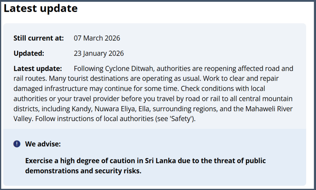 The website was last updated on January 26, 2026, and that update remains in effect as of today (07). The update mainly mentions the situation following Cyclone Ditwah and advises travellers to seek official information from local providers about road repairs and the areas they plan to visit before travelling to Sri Lanka.