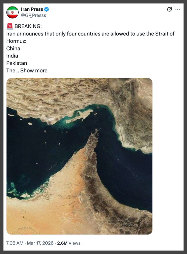 A viral claim circulating across platforms in March 2026 alleges that Iran has officially restricted access to the Strait of Hormuz to only four countries, typically named as China, India, Pakistan, and a fourth country that varies depending on the post. The claim is often framed as urgent “BREAKING” news, implying a formal geopolitical decision with major global consequences.