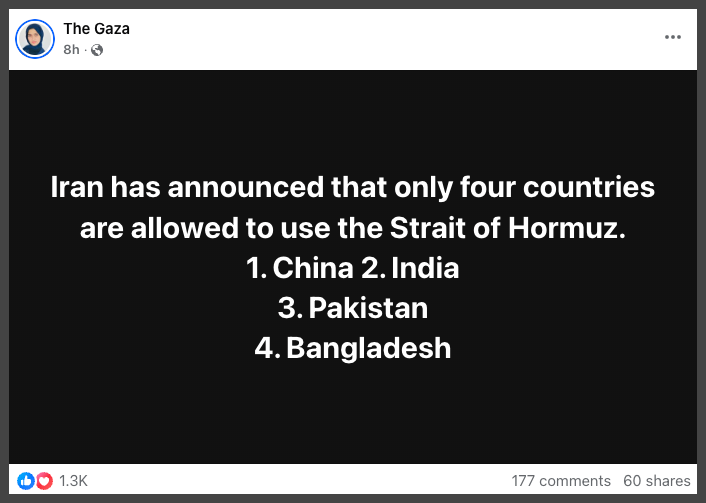 The claim appears in multiple versions, often with identical wording but inconsistent details. Most posts state that Iran has “announced” a list of four countries allowed to use the strait, but the fourth country varies between Russia, Turkey, or Bangladesh.
