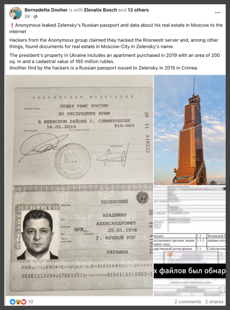 A video circulating on Facebook and X claims that Anonymous leaked Zelenskyy’s Russian passport and real estate data in Moscow. The alleged aim is to show that Zelenskyy holds undisclosed Russian citizenship and Moscow assets.