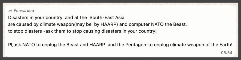 We found circulating message on WhatsApp states: “Disasters in your country and in South-East Asia are caused by climate weapon (may be by HAARP) and NATO Beast computer. To stop disasters, ask them to stop causing disasters in your country!”
