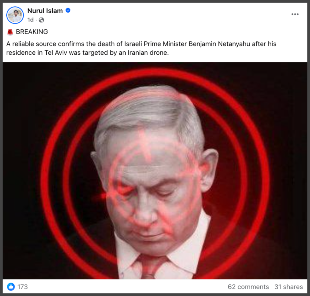 The viral posts typically claim that Netanyahu was killed, with some versions alleging an Iranian drone strike targeted his residence in Tel Aviv.