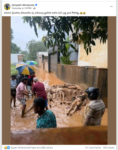 Additionally, the person wearing a red-and-blue shirt in the photo had earlier posted a video showing houses behind the Gampola Keells supermarket submerged in flood. That video can be viewed here.