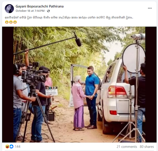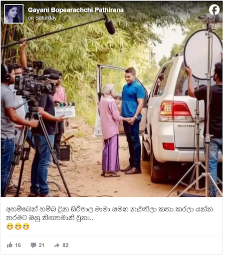 A photo of Parliamentarian Namal Rajapaksa was circulated on social media with the caption, “He was so humble that he stopped and talked to Uncle Siripala, whom he met by chance.”