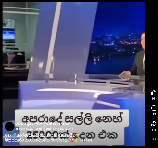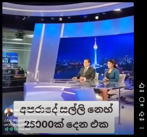 A short video clip, which appears to be scenes at the end of the Ada Derana 6.55 pm news broadcast, was shared widely among social media users, claiming that the ‘Ada Derana’ news anchor Sankha Amarajith, featured in the footage, stated that the government’s Rs. 25,000 relief package for families affected by the disaster was unnecessary. The viral clip is as follows.