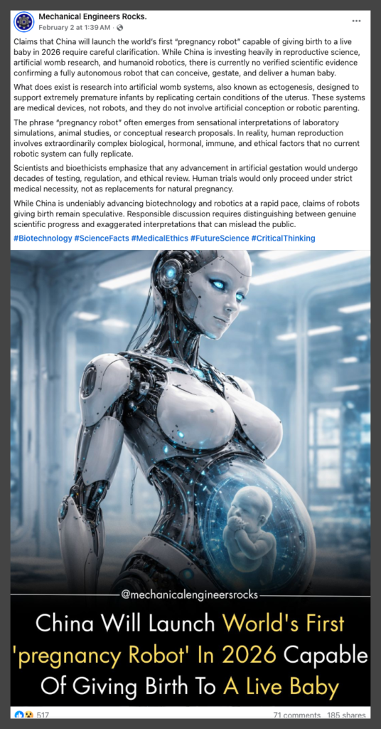 The 2026 “pregnancy robot” claim appears to follow a similar pattern, using speculative imagery and unverified interviews to create the impression of an imminent breakthrough.