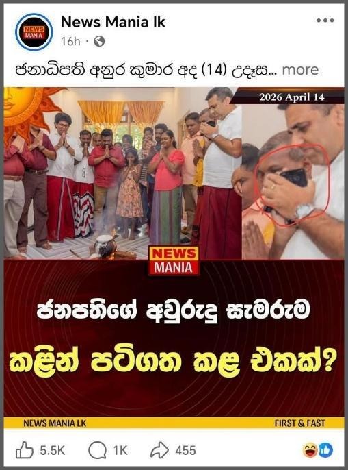 Our investigation shows that the posts circulating on social media claiming that the footage of President Anura Kumara Dissanayake participating in a New Year celebration is a pre-recorded video are false. Although the official photos posted regarding the incident show the time as 11:10 on a mobile phone held by one of the people at the time the milk spilled, it can be assumed that about 19 minutes had passed from the time the fire was lit to the time the milk spilled. The Administrative Officer of the Grama Niladhari of the Galnewa Division, local journalists, and the Presidential Media Division have confirmed that the President attended the New Year celebrations at the relevant residence on April 14.