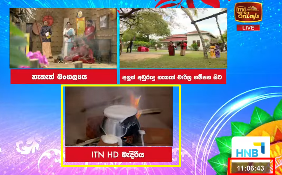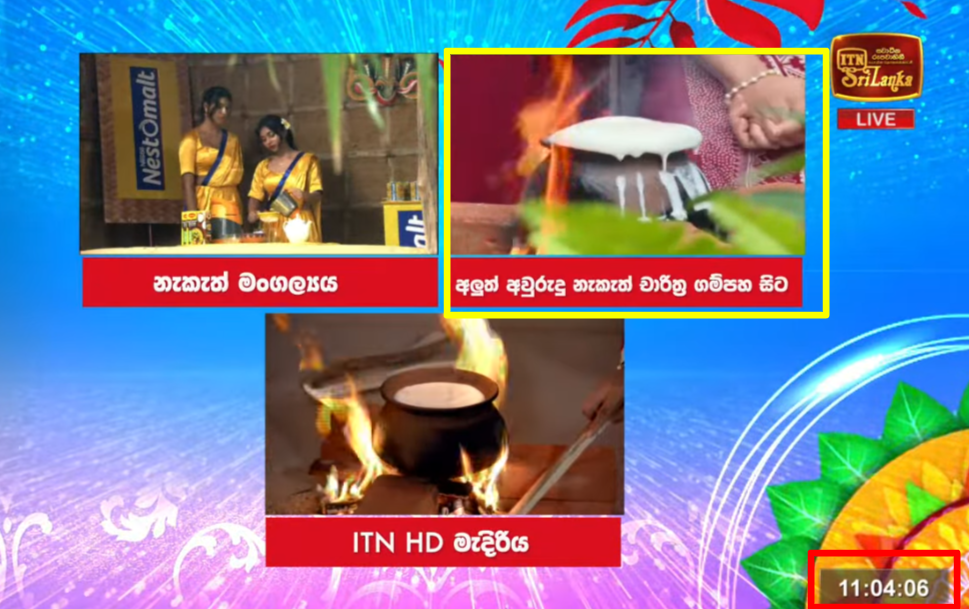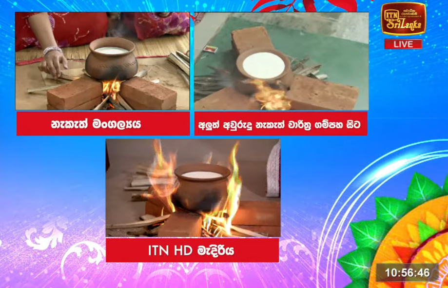 Accordingly, during the auspicious rituals broadcast on Independent Television, the Prime Minister, along with the ministers, attended the lighting of the fire at the Prime Minister’s official residence. It was observed that the ritual was being performed live and that the milk was being poured out live, and we took steps to examine how the times when the milk was poured out were stated. Attending the event were a group of employees of the channel from Gampaha and a group of employees from the HD studio of Independent Television and the filming crew of ‘Kopi Kade’ (a mega teledrama broadcast on the Independent Television channel).