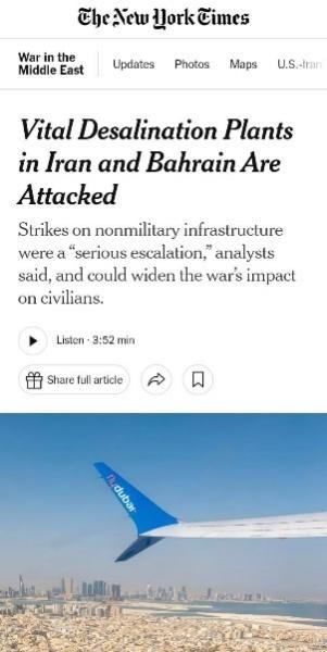 However, on March 7 and 8, attacks were carried out targeting desalination plants in Iran and Bahrain and Iranian Foreign Minister Abbas Araghchi has stated that the United States attacked a desalination plant in Iran. Bahrain’s Interior Ministry also said an Iranian drone had struck its power plant. The damage to Bahrain’s desalination plant reportedly affected the water supply to about thirty villages. Kuwait and the United Arab Emirates have also reported missile-related damage to desalination plants during the clashes.