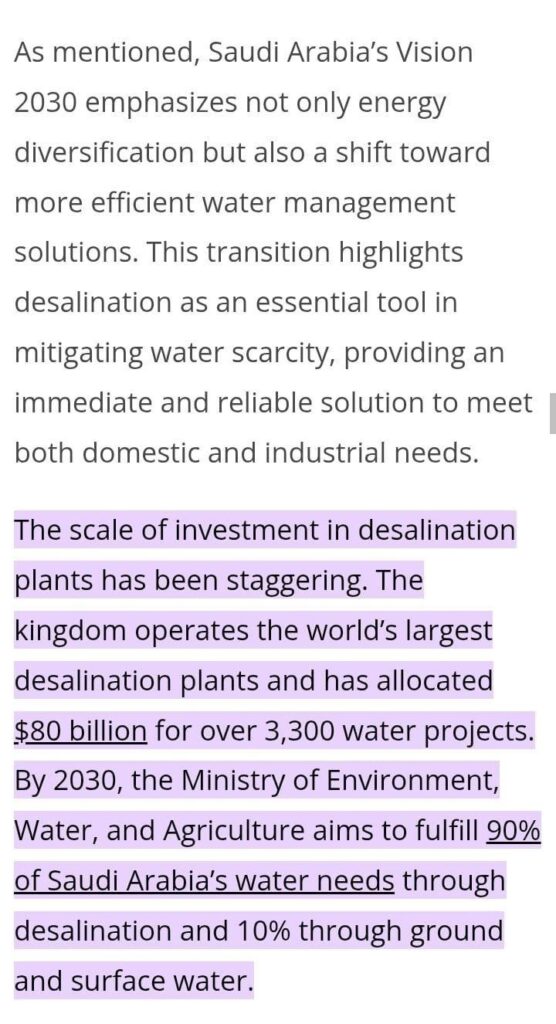 Saudi Arabia is one of the world’s largest producers of desalinated water, and the Saudi Ministry of Environment, Water and Agriculture aims to meet 90% of the country’s total water demand through desalination by 2030, with the remaining 10% planned to come from groundwater and surface water. More information on this is here.