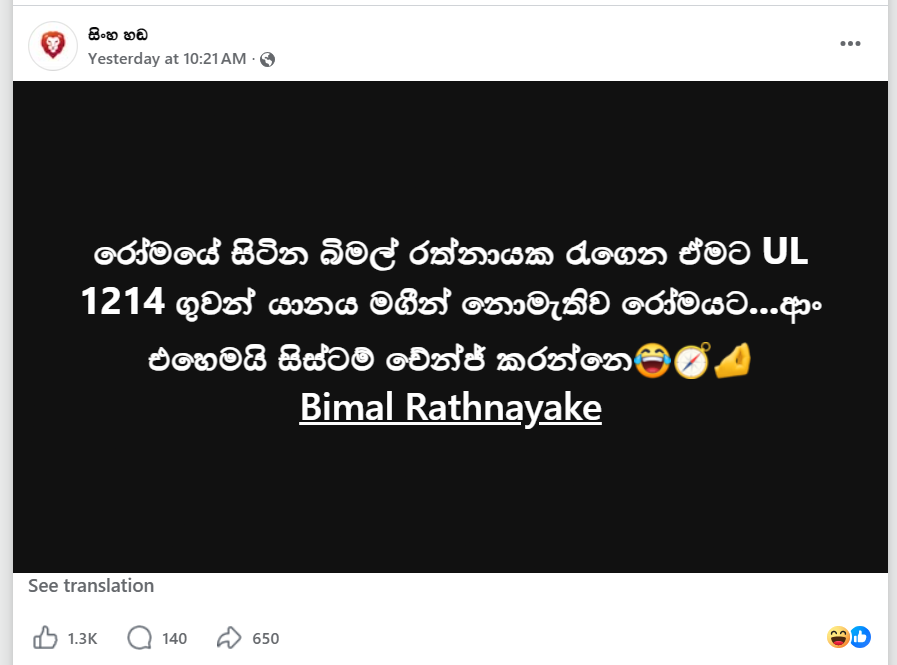 The following social media post, published on March 9, claimed that Minister Bimal Rathnayake was in Rome, and that a UL 1214 flight had flown to Rome without passengers to bring him back.