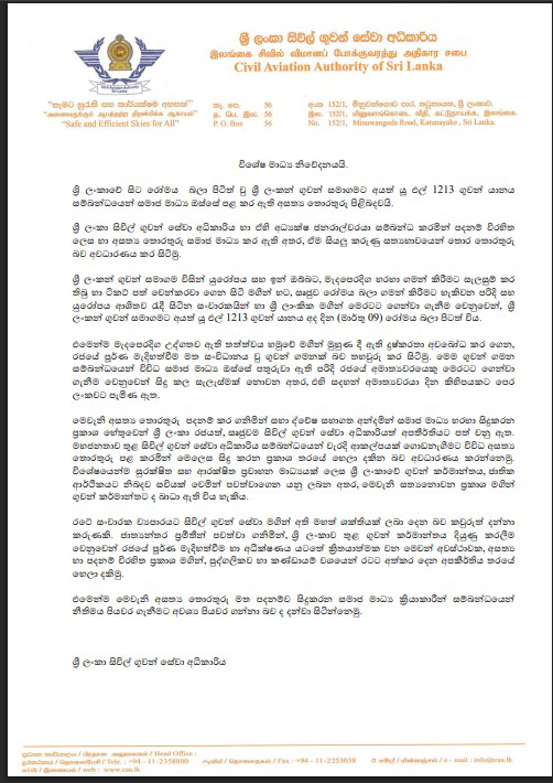 The Civil Aviation Authority issued a statement on March 9 regarding information circulating on social media about the UL 1213 flight belonging to SriLankan Airlines, which departed from Sri Lanka to Rome. The statement mentioned that the flight had been organized with full government intervention to assist passengers facing difficulties due to the situation that had arisen in the Middle East, and that the social media posts circulating about the flight were false. The statement further explained that the UL 1213 flight departed for Rome on March 9 in order to allow passengers who had planned to travel to Europe and beyond via the Middle East, and who had already booked tickets, to travel directly to Rome.
