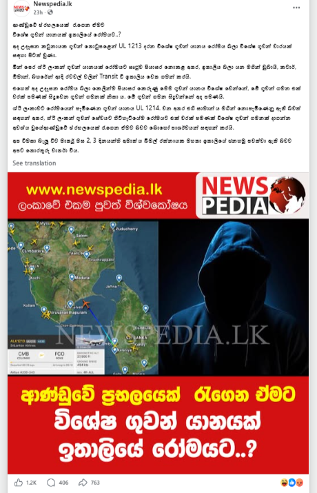 SriLankan Airlines Media Spokesperson Deepal Perera also stated that the posts claiming a SriLankan Airlines flight departed to Rome to bring Minister Bimal Rathnayake back were completely false.