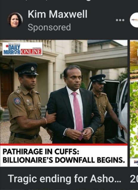 A commercial advertisement circulating on Facebook claimed that the Daily Mirror had reported the story under the headline, “Pathirage is cuffed: Here’s the beginning of a billionaire’s downfall.”
