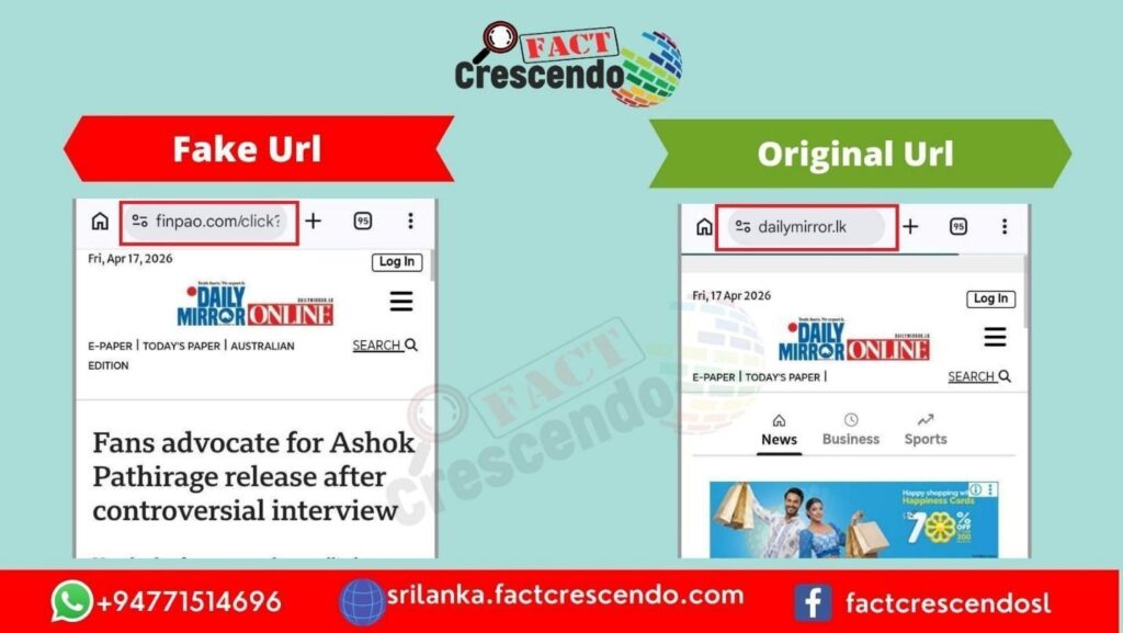 Furthermore, when examining the domain of the article, it was found that it was not hosted on the official Daily Mirror website domain (dailymirror.lk), as shown below.