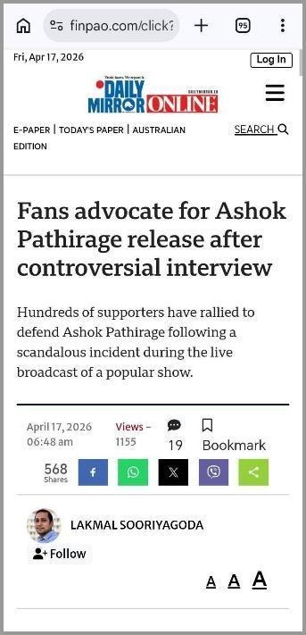 The article, titled “Fans advocate for Ashok Pathirage release after controversial interview,” was not published by the Daily Mirror newspaper or its official website. This has been confirmed through the official Daily Mirror website, as shown below.