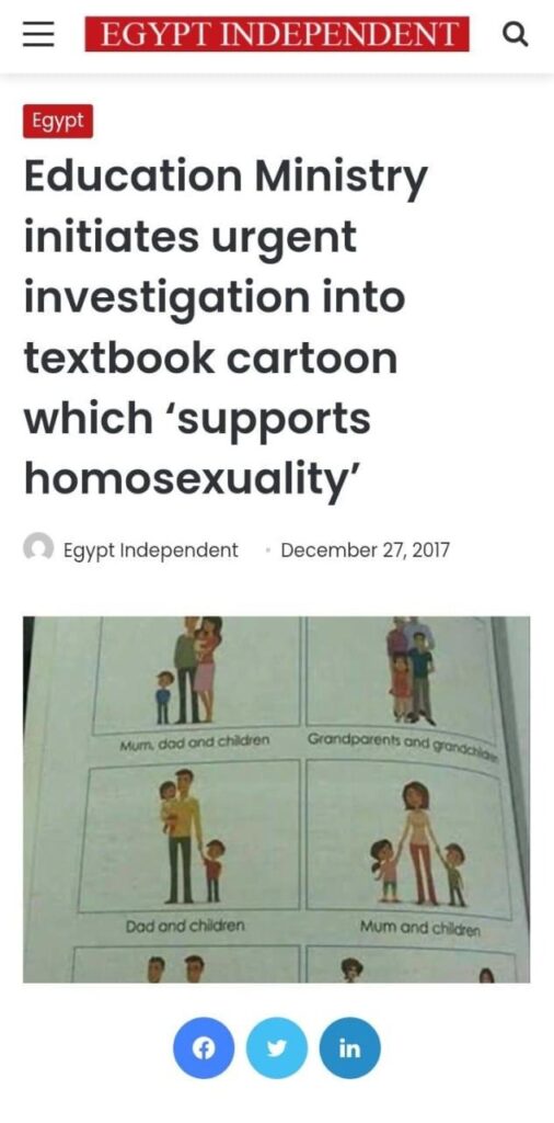 Egyptian media reported in 2017 that the Egyptian Ministry of Education launched an urgent investigation into this textbook page, which ‘supports homosexuality’.