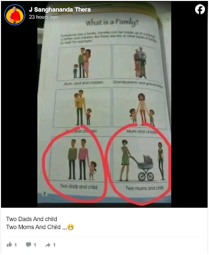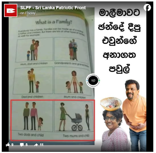 Several posts went viral, implying homosexuality is being introduced to children in Sri Lanka through a lesson on ‘diverse families’ with illustrations depicting two mothers and a child and two fathers and a child.