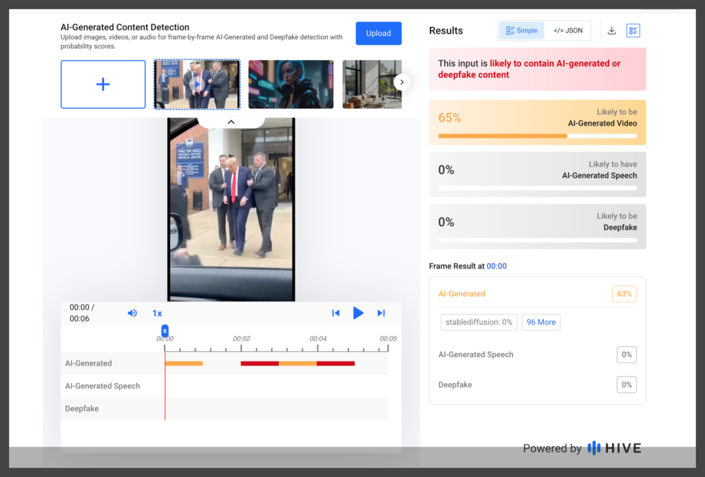 We also used Hive Moderation, an AI-based content detection tool, to analyze this video, and the results indicate it is highly likely AI-generated, consistent with the lack of credible reporting as of this publication.