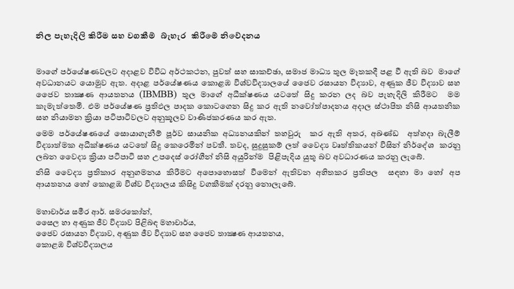 “Neither I, our institution, nor the University of Colombo will be held responsible for any adverse consequences resulting from failure to follow proper medical treatment.”