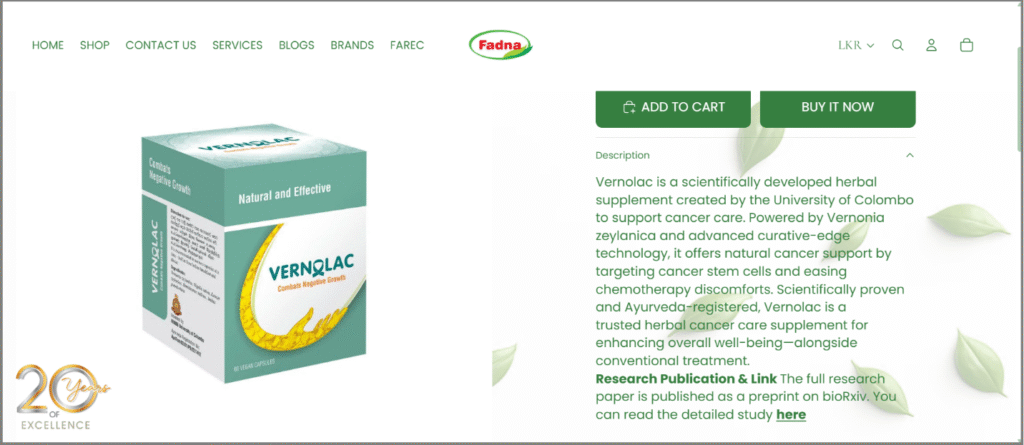 Vernolac, introduced by some major media outlets as a cancer treatment and sold by FADNA (Food & Nature Pvt. Ltd.) was mentioned on its online marketplace as follows.