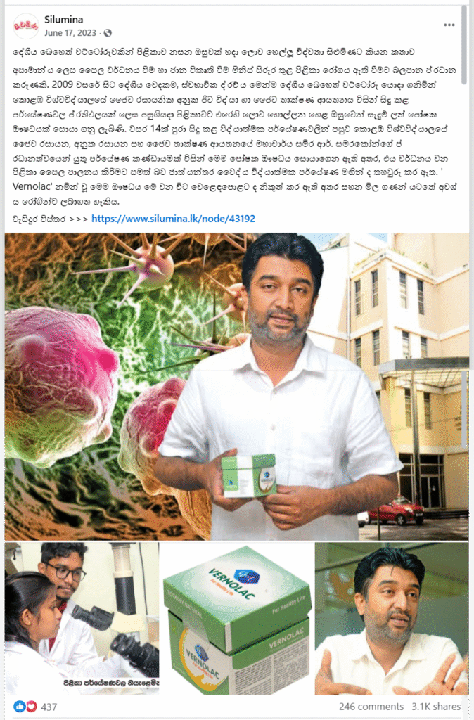 Although it is justified that ‘Vernolac’ has shown anti-cancer activity in laboratory experiments and further research has been conducted in animal studies, toxicology, and well-designed clinical trials to evaluate safety and efficacy in humans, the message that should be conveyed to the public is that this is not a proven cancer treatment, but an experimental nutritional medicine with internal results. It is misleading to market this product by claiming that it “kills cancer in humans.” The research paper on ‘Vernolac’ is here.