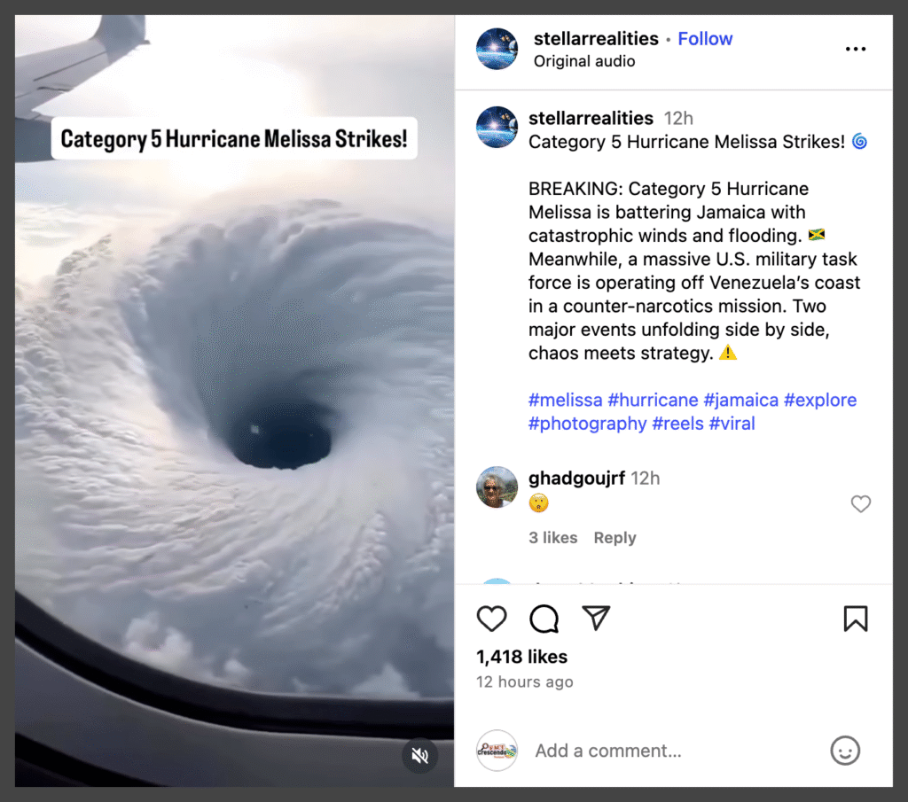 Although the viral footage is AI-generated, authentic footage from inside Hurricane Melissa’s eye does exist. U.S. Air Force “Hurricane Hunter” crews from the 53rd Weather Reconnaissance Squadron recorded real footage on October 27. You can view that genuine footage below.