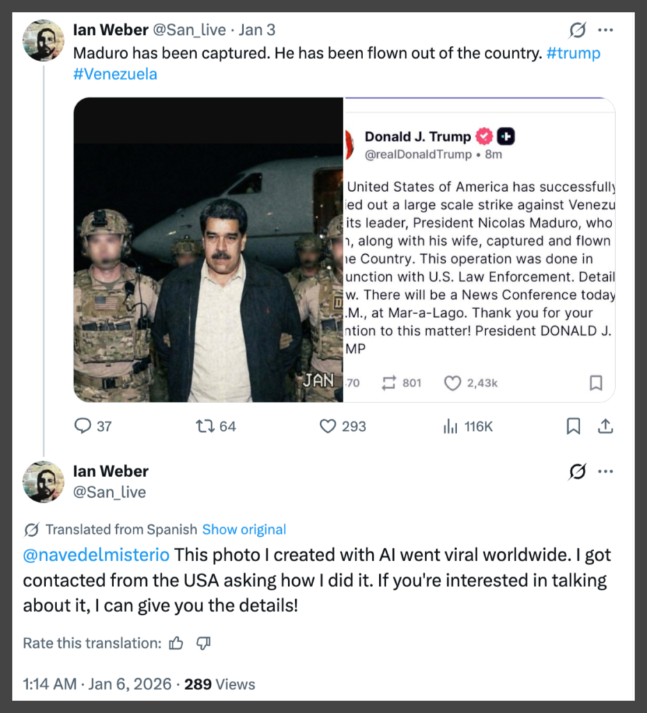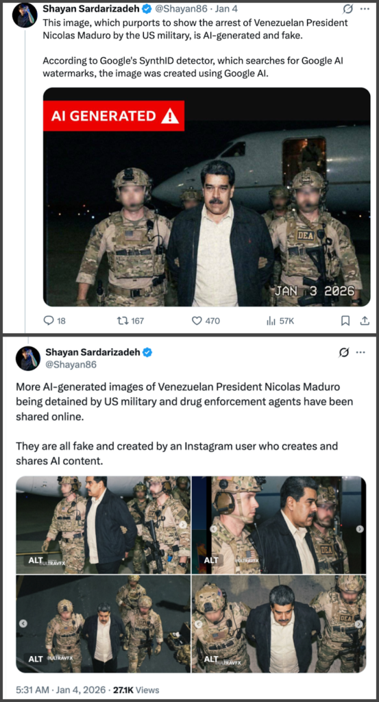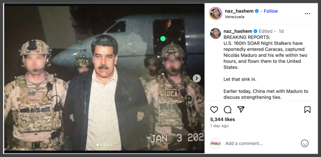 When significant international news breaks, social media often sees a rapid spread of unverified information. AI tools can generate visuals that appear authentic, and the speed of sharing can exceed the pace of fact-checking. In this case, the event of Maduro’s capture was followed by the circulation of unverified images and narratives.(Source)