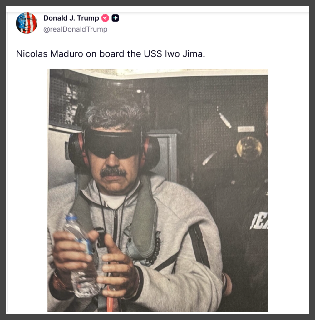 Shortly after the United States confirmed that Venezuelan President Nicolás Maduro had been taken into custody, former U.S. President Donald Trump shared an official image of Maduro in custody on social media, which was later reported by The New York Times. The image shows Maduro blindfolded and handcuffed aboard a U.S. naval vessel and differs clearly from the viral image circulating online, which depicts Maduro being escorted by armed soldiers on land. The setting, composition, uniforms, and overall visual details in Trump’s posted image do not match those in the viral photo, indicating they are not the same source or moment. (Source)