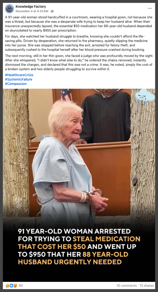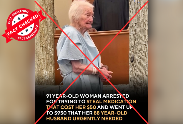 A story circulating on social media claims a 91-year-old woman was arrested for stealing her 88-year-old husband’s heart medication after the prescription price allegedly rose from about $50 to around $950, and that a judge later dismissed the case and ordered help paying for the medication. The post has been shared widely on platforms such as Facebook and Instagram, where emotional “injustice” narratives often spread quickly. However, we found this claim to be false.