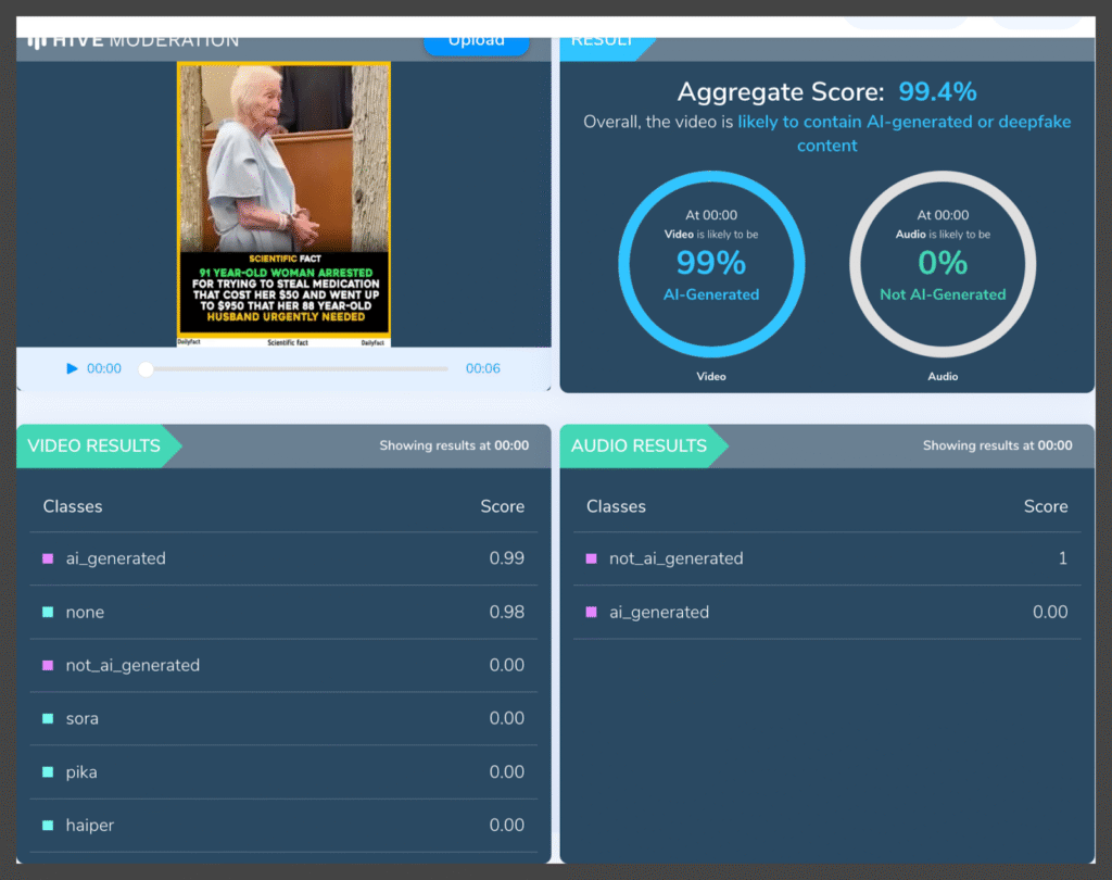 To further assess whether the viral courtroom-style clip is authentic, we also ran the circulating video through Hive Moderation’s AI-generated image/video and deepfake detection tool, which outputs confidence scores estimating the likelihood that media is synthetic. Hive’s output indicated the video is very likely AI-generated (99.99%), consistent with the broader pattern of this story appearing primarily in social media posts without accompanying verifiable documentation.