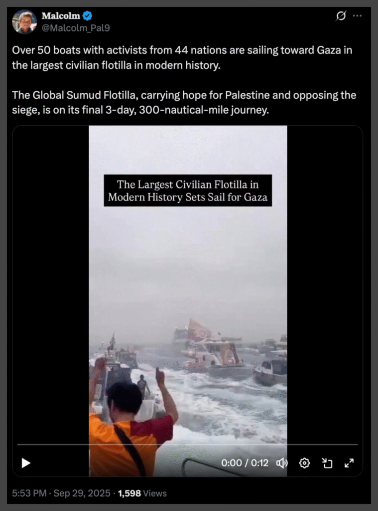 While that particular video is false in its claim, there are actual flotilla efforts underway in 2025 aimed at delivering humanitarian aid to Gaza or challenging Israel’s naval blockade. One of the most prominent is the Global Sumud Flotilla, launched in late August 2025. According to Al Jazeera, it consists of over 50 vessels from more than 44 nations and is intended to break what the organizers call Israel’s “illegal siege” of Gaza. The flotilla departed from Spain, made a stop in Tunisia, and then resumed toward Gaza.