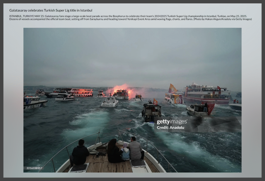 Multiple sources verify the Galatasaray celebration took place on May 25-26, 2025. According to Getty Images, fans joined a yacht parade across the Bosphorus from Sarayburnu to Yenikapı, complete with flags, chants, and flares.