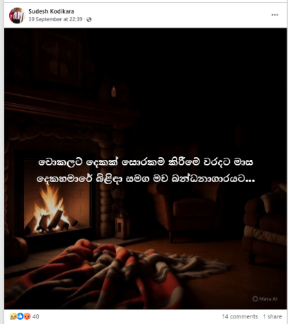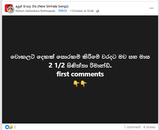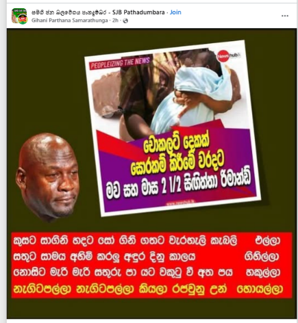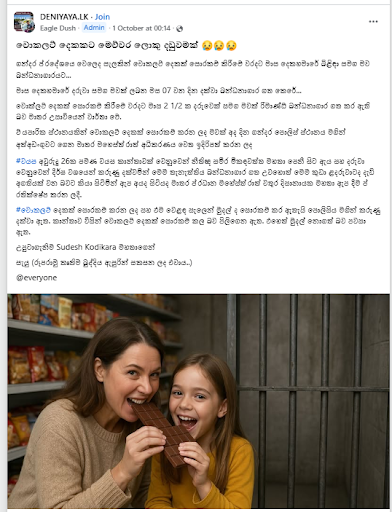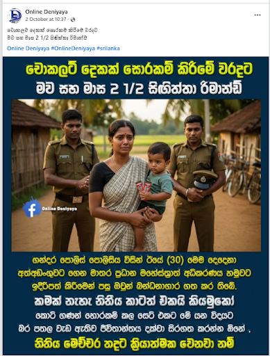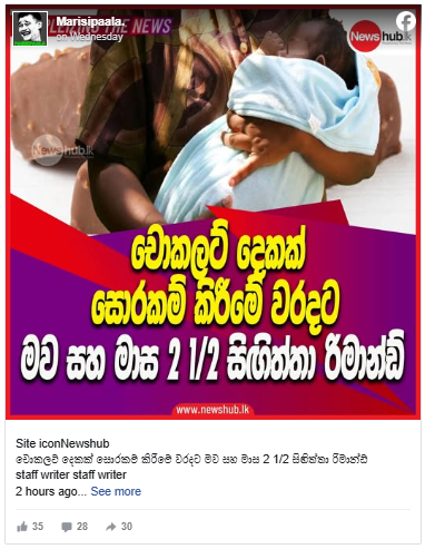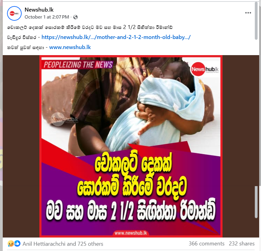 A post was circulating on social media stating, “A Mother and a 2 1/2-month-old baby were remanded for stealing two chocolates.” (Translated from Sinhala)