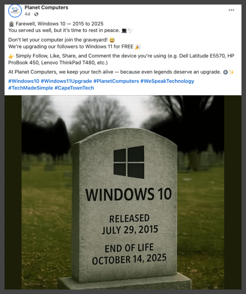 Social media users have shared posts featuring memes resembling gravestones engraved with “Windows 10: Released July 29, 2015 – End of Life: October 14, 2025,” with captions like “RIP Windows 10.”