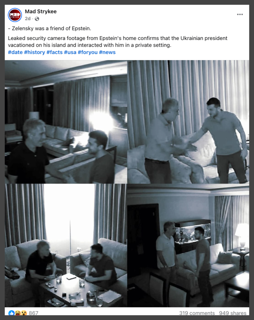Posts sharing the claim typically include images described as “leaked security footage,” often accompanied by captions asserting that Zelensky visited Epstein’s private island.
